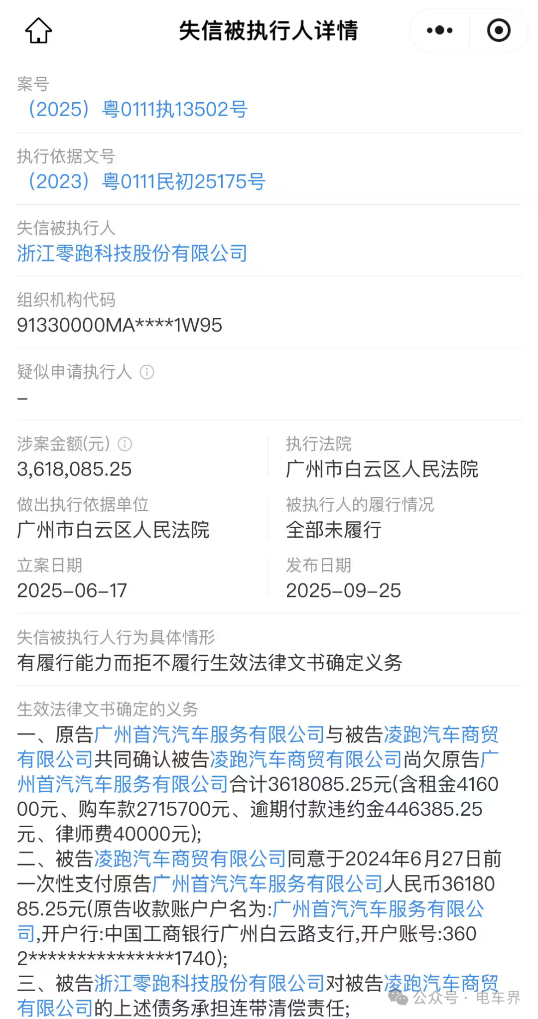 电车界9月26日消息,零跑汽车及其CEO朱江明成老赖了。