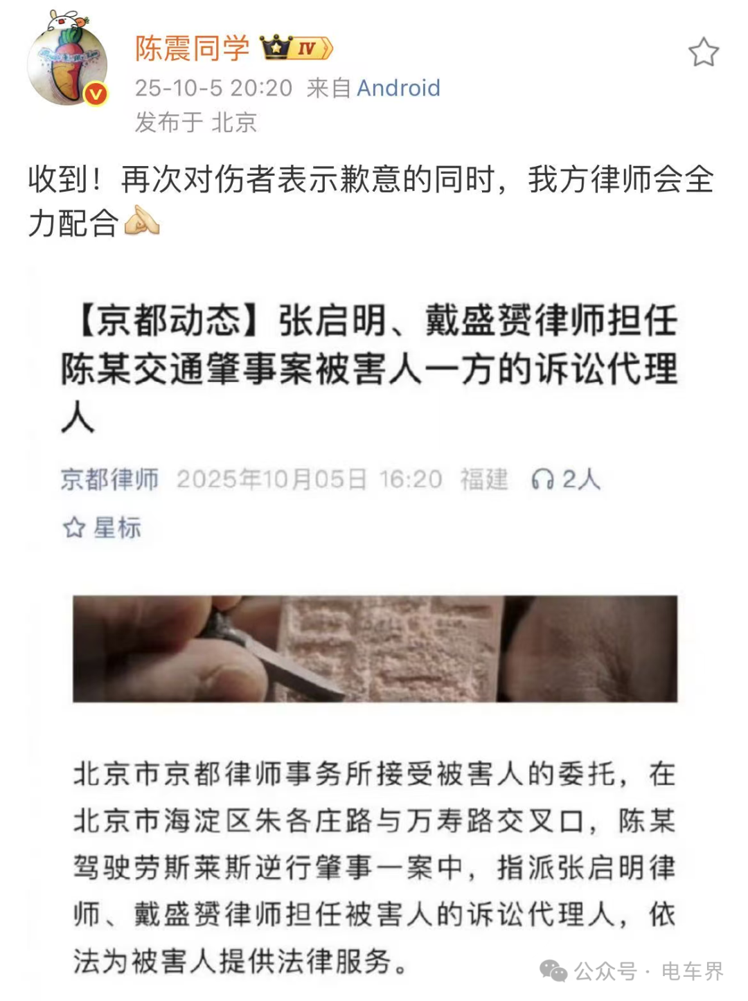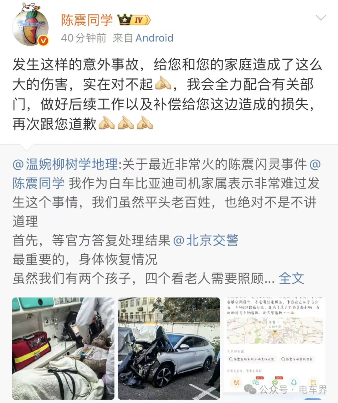 随后,陈震又在微博发文:“我都看到了,是我的问题,一切负面照单全收,全力配合解决问题中,不会有丝毫懈怠。”他同时指出,“事故经过以官方公告、车辆EDR数据为准”,并“向对方车辆道歉,向大家道歉”。