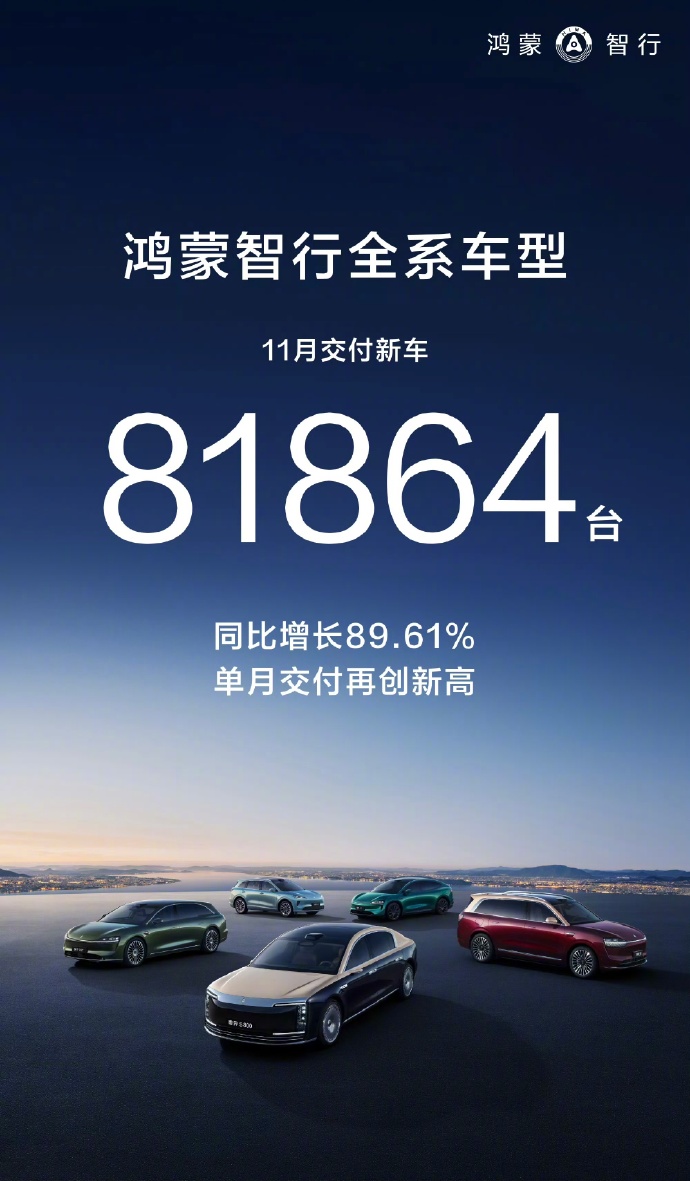鸿蒙智行:全系车型11月交付81864台,同比增长89.61%
