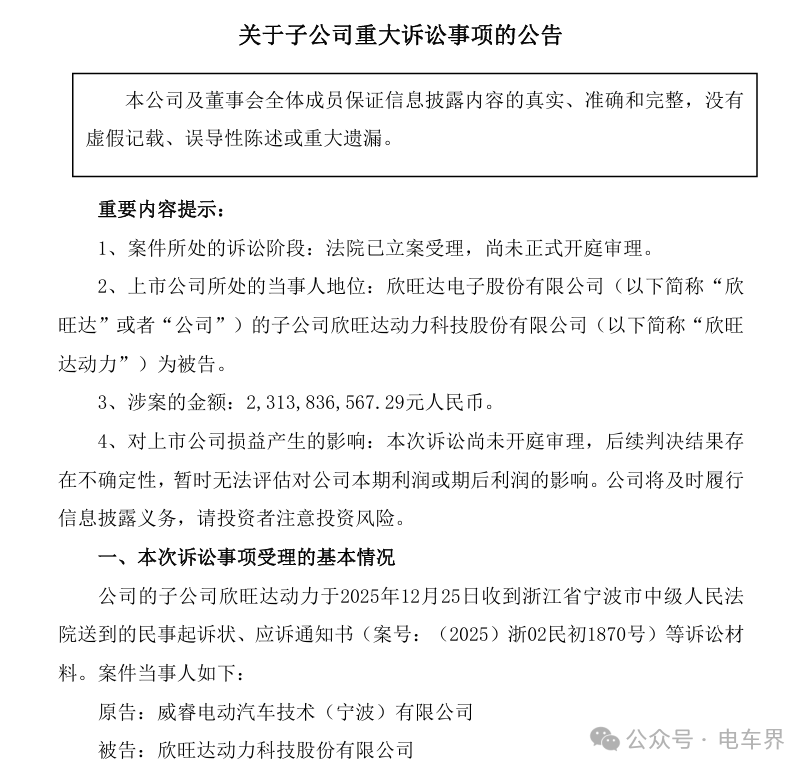 根据欣旺达昨天发布的公告,欣旺达旗下子公司欣旺达动力已于12月25日收到浙江省宁波市中级人民法院送达的法律文书,包括一份民事起诉状。