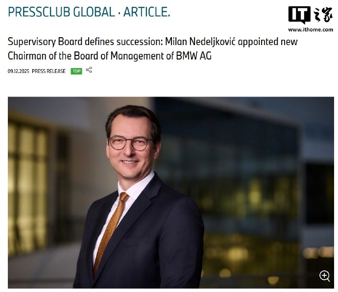 宝马集团今日官宣,Milan Nedeljković(米兰・内德尔科维奇)将于2026年5月14日起担任宝马集团管理董事会主席。(IT之家)